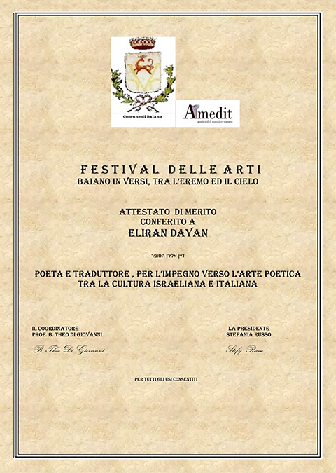 בשנת 2023 תרגמתי מספר שירים של משוררים איטלקיים לעברית ובנוסף שלחתי מספר שירים שלי אליהם. במהלך פסטיבל אומנויות השירה שנערך בעיר באיאנו באיטליה, הפתיע אותי המשורר האיטלקי תיאו ברטולומאו די ג'ובאני בתעודת הצטיינות שקיבלתי מטעם הפסטיבל. זה כבוד גדול בעבורי ואני לא חושב שאני ראוי לו, אבל זה היה מרגש מאוד. |