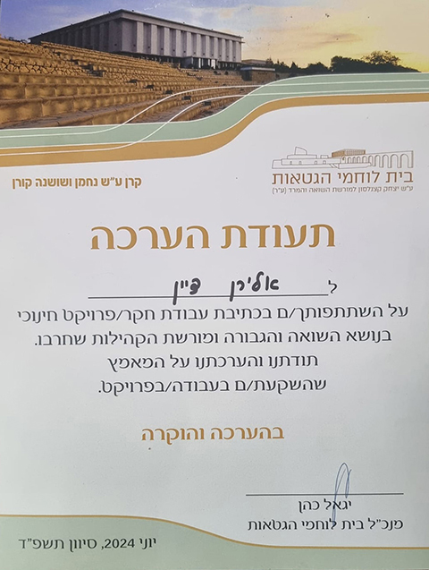 הטקס המרגש נערך באולם מוזאון בית לוחמי הגטאות, בעת מלחמת "חרבות ברזל" וחולקו בו פרסים ומלגות במספר תחומים. לפני הטקס היה סיור במוזאון עצמו שהועצם בעיניי והיה קשה ומרגש בשל העובדה שהמדינה נמצאת במלחמה קשה בעקבות אירועי הטבח ביישובי העוטף בדרום ודומים לעדויות של שורדי השואה.
